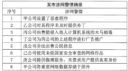 1.(一)根据以下情境材料,回答第1~4题。市民王某报警称戊公司泄露了其个人的手机号码和身份证号码,对其生活造成了严重的影响。接警后,市公安局指挥中心对该类警情进行统计分析发现,该市涉网警情较多。为此,市公安局指挥中心对该市涉网警情进行了梳理汇总,有关警情信息如下表所示:(2018年国考)