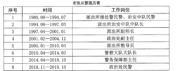 17.下表是民警老张(1967年9月出生)从警以来的工作履历。根据该表信息,下列选项对老张从警生涯描述正确的有:()(2020年国考)