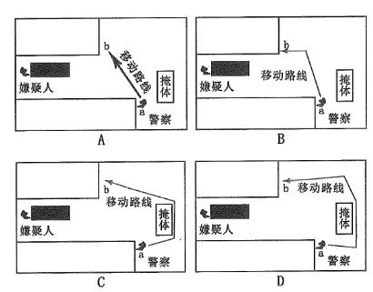 4.(一)根据以下情境材料,回答第1~4题。2015年10月19日上午10时许,新城分局巡警小李和小王在辖区内武装巡逻,行至花园街时,发现两名男子正从东兴小区灌木丛中钻出来,其中一人背一件大号双肩包。小李和小王上前拦截这两名男子,实施盘查。(2017年公安联考)如下图,小李与嫌疑人持枪对抗的过程中要从a点移动到b点,最佳移动路线是:()(单选)
