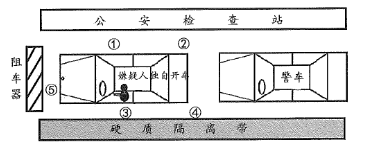 39.某公安检查站接到110情报指挥中心指令,拦截某重大刑事案件逃犯所驾驶的一辆轿车,该逃犯随身携带有枪支。某公安检查站经工作,将嫌疑车辆拦截(如下图所示),逃犯使用枪支对抗,处置民警决定使用枪支,民警选择的以下射击位置,合理的是:()(改编自2022年公安联考延考)