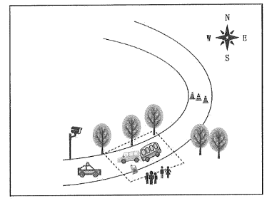 23.某日16时许,江海高速恒宁段由西往东75千米,下老树桥道口200米处,一辆装载易燃易爆危险化学物品的箱柜车与一辆客运大巴车发生追尾事故。事故导致箱柜车装载的危险货物掉落,所幸无人员伤亡,正在老树桥收费站执勤的高速交警闻讯立即前往现场处置。根据下图所示,执勤交警首先应采取的措施是:()(2024年多省联考)