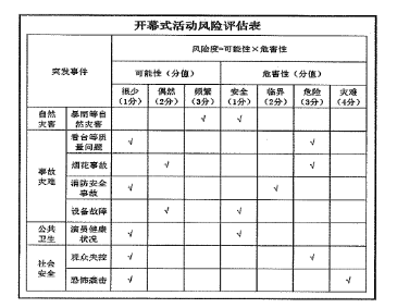 5.某县人民政府拟举办第20届石榴节活动,开幕式由红星文化传媒公司承办,活动举办前红星文化传媒公司向公安机关提出安全许可申请,同时提交相关材料,县公安局治安大队民警对开幕式现场进行踏勘,制作风险评估表(如下表)。根据风险评估表中的评价标准,风险度最大的突发事件是:( ) (2019年公安联考)