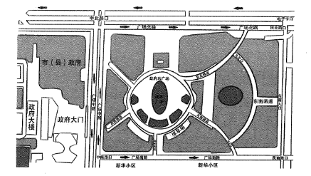 19.(五)根据以下情境材料,回答第16~19题。在2020年全国两会上,全国人大代表杨宝玲建议,应在进一步加强规范市场管理的同时因地制宜,释放出“地摊经济”的最大活力。某地政府受其启发,开放了政府东广场(政府东广场位于市政府东侧)供市民摆摊经营,开放时间为每天19:00至22:00,如下图所示。某地公安机关启动应急预案,对广场及周边部署了巡逻警力和备勤警力,随时应对突发情况。(2020年多省联考)