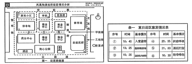 15.(四)根据以下情境材料,回答第12~15题。某市风凰街派出所地处城市中心区,辖区面积9平方千米,实有人口4.2万人,属于全区政治、经济、商贸、文化的核心区域,治安状况较为复杂。为提高平安社区评价指数,提升人民群众安全感和获得感,派出所定期收集辖区警情数据,制作风压街派出所巡区情况分析相关图表,进行综合分析研判。(2021年多省联考)