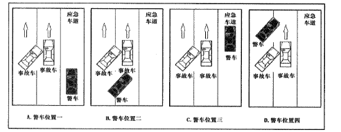 33.某日22时许,两辆轿车在城市道路发生交通事故,交警到达现场后,根据现场情况在来车方向100米处利用警戒带、反光锥桶划出警戒区。现场安全防护设置完成后,交警打开警灯,将警车停放在事故现场后开展勘查工作。根据“交通事故现场示意图”(见下图),选停警车位置恰当的是: ( ) (2022年多省联考)