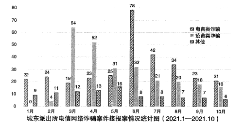 18.(五)根据以下情境材料,回答第15~18题。某市公安局在2021年开展了进一步加强全市公安机关打击治理电信网络诈骗犯罪攻坚行动。城东派出所积极落实市公安局要求,安排民警小孙、小王做好反电信网络诈骗宣传工作,全力维护人民群众财产安全。为此,两名民警积极开展工作并制作了电信网络诈骗案件接报案情况统计图(2021.1-2021.10) 。 (2021年黑龙江省考)