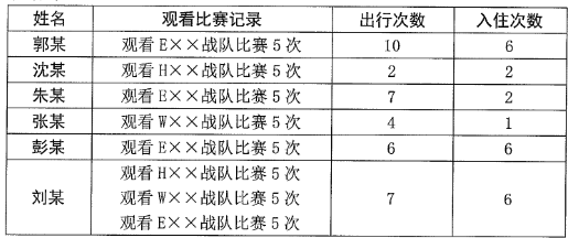 13.(四)根据以下情境材料,回答第12~14题。2021年,EDG战队获得了电竞国际赛总冠军,使得大量游戏迷更加关注电竞比赛。某省多地举办了大型电竞比赛,吸引年轻观众进入场馆观看。为保障比赛顺利举行,公安部门加强了情报搜集、安全宣传和数据研判,多方面增强安保工作的实效性。电竞比赛的火爆也使“黄牛”看到利益,成为其倒票的新热点。下表为最近半个月内部分“黄牛”嫌疑人员观看比赛、出行和入住宾馆的记录。(2022年江苏省考)