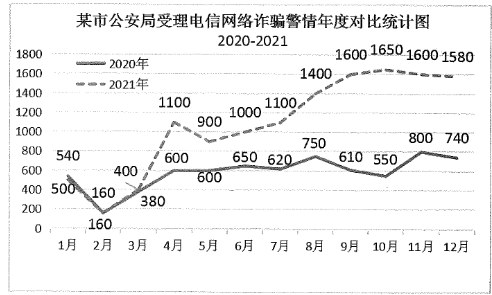 9.东南沿海某市公安局反诈中心对2020年、2021年受理的电信网络诈骗警情进行处理,绘制了“某市公安局受理电信网络诈骗警情年度对比统计图”(见下图),根据图中信息,对2021年各月份受理电信网络诈骗警情数量分析正确的有:()(2023年国考)