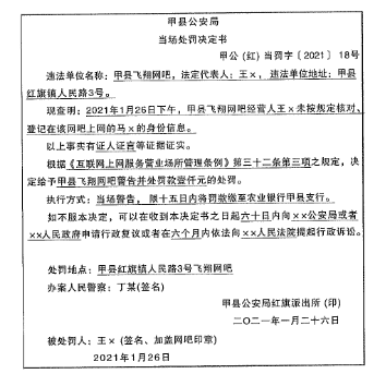 15.下面是甲县公安机关对一网吧进行当场处罚时制作的当场处罚决定书,根据该处罚决定书,下列说法正确的有:()(2021年多省联考)