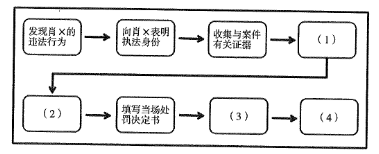 40.晓山县公安局南华派出所民警在工作中发现,南华街道居民肖×将房屋出租给无身份证件的人,民警拟当场对肖×进行处罚。下图为当场处罚的流程,空白处内容包括:①听取肖×陈述和申辩:②告知肖×拟作出处罚的内容、事实等;③告知肖×有要求听证的权利;④向肖×交付处罚决定书:⑤报所属公安机关备案。对于 (1)至(4)执法环节,下列选项排序正确的是:()(2024年多省联考)