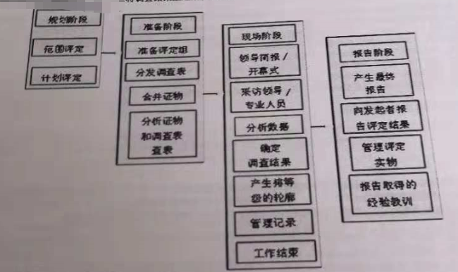 14、下图显示了SSAM的四个阶段和每个阶段工作内容。与之对应,()的目的是建立评估框架,并为现场阶段准备后勤方面的工作。()的目的是准备评估团队进行现场活动,并通过问卷进行数据的初步收集和分析。()主要是探索初步数据分析结果,以及为被评组织的专业人员提供与数据采集和证实过程的机会,小组对在此就三个阶段中采集到的所有数据进行()。并将调查结果呈送个发起者 @( )