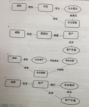 15、 风险评估的基本要素包括脆弱性、资产、威胁、风险及安全措施,下面给出的风险评估部分基本要素之间的关系图,哪项是错误的()。@( )