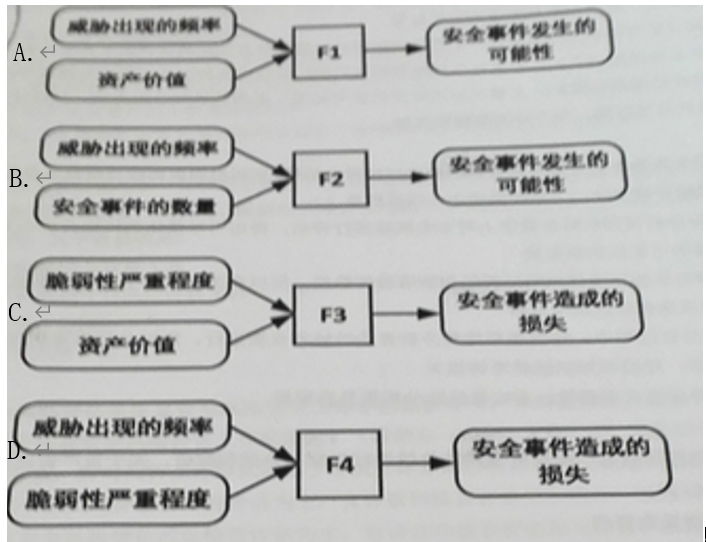 3、小陈自学了风评的相关国家准则后,将风险的公式用图形来表示,下面F1,F2,F3,F4分别代表某种计算函数,四张图中,那个计算关系正确()@( )