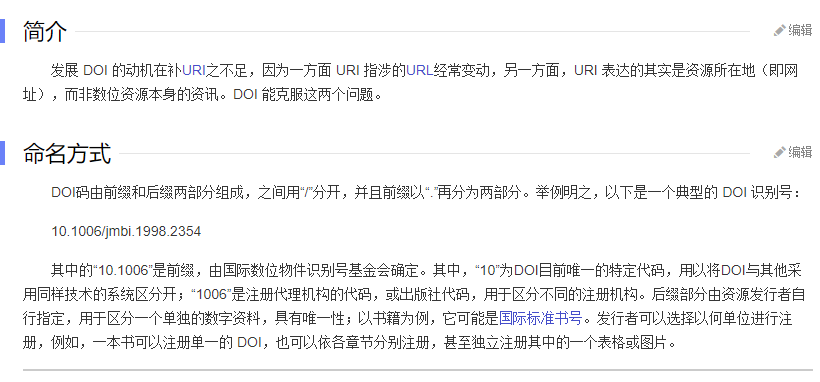 12、 数位物件识别号 【Digital Object Identifier,简称DOI 】是一套识别数位资源的机制,涵括的对象有视频报告或书籍等等。它既有一套为资源命名的机制,也有一套将识别号解析为具体位址的协定。DOI码由前缀和后两部分组成,之间用“/”分开,并且前缀以“.”再分为两部分。以下是一个典型的DOI识别号 10.1006/jmbi.1998.2354,下列选项错误的是()@