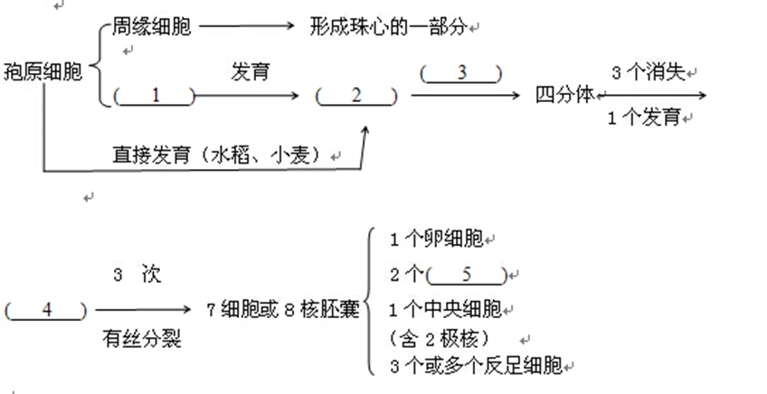 1. ________ 2. ________ 3. ________ 4. ________ 5. ________A.有丝分裂 B.减数分裂 C.胚囊原基 D.周缘细胞 E.反足细胞 F.精细胞 G.单核胚囊 H.二核胚囊 I.二分体 J.四分体