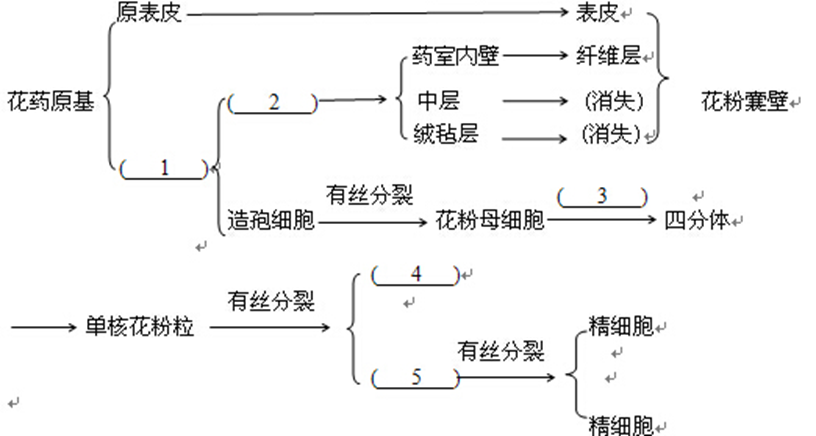 1. ________ 2. ________ 3. ________ 4. ________ 5. ________A.无丝分裂 B.有丝分裂 C.减数分裂 D.花粉囊壁原始细胞 E.周缘细胞 F.营养细胞 G.花粉母细胞 H.孢原细胞 I.生殖细胞 J.精细胞