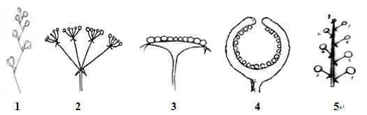 1. ________ 2. ________ 3. ________ 4. ________ 5. ________ A.总状花序 B.头状花序 C.伞形花序 D.伞房花序 E.穗状花序 F.隐头花序 G.复伞形花序 H.肉穗花序 I.二歧聚伞花序 J.单歧聚伞花序