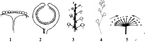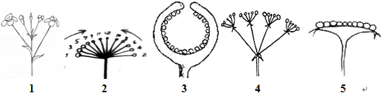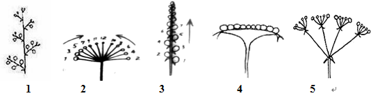 1. ________ 2. ________ 3. ________ 4. ________ 5. ________ A.总状花序 B.头状花序 C.伞形花序 D.伞房花序 E.穗状花序 F.隐头花序 G.复伞形花序 H.肉穗花序 I.二歧聚伞花序 J.单歧聚伞花序