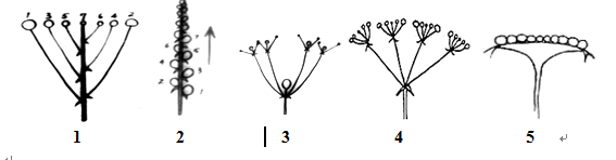 1. ________ 2. ________ 3. ________ 4. ________ 5. ________ A.总状花序 B.头状花序 C.伞形花序 D.伞房花序 E.穗状花序 F.隐头花序 G.复伞形花序 H.肉穗花序 I.二歧聚伞花序 J.单歧聚伞花序