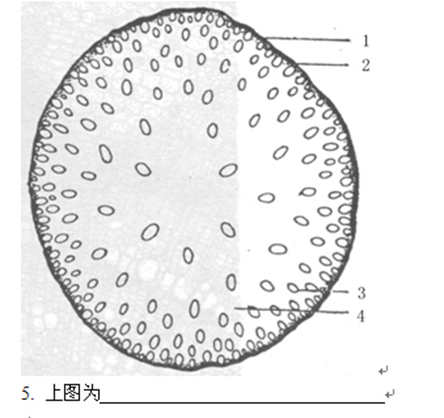 1. ________ 2. ________ 3. ________ 4. ________ 5. ________A.表皮 B.次生韧皮部 C.次生木质部 D.基本组织 E.机械组织 F.维管束 G.禾本科植物茎的结构 H.禾本科植物根的结构 I.周皮 J.维管形成层