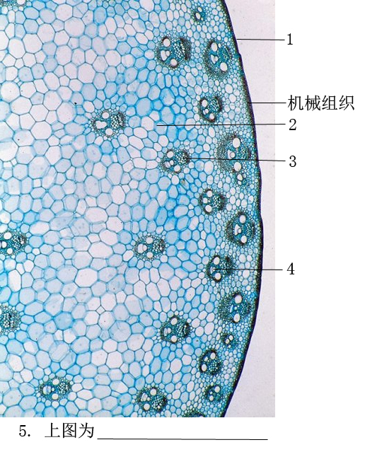 1. ________ 2. ________ 3. ________ 4. ________ 5. ________A.表皮 B.次生韧皮部 C.次生木质部 D.基本组织 E.机械组织 F.维管束 G.禾本科植物茎的结构 H.禾本科植物根的结构 I.周皮 J.维管形成层