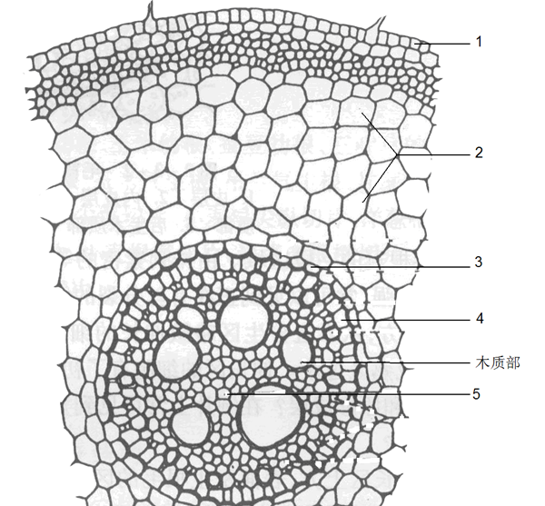 1. ________ 2. ________ 3. ________ 4. ________ 5. ________A.表皮 B.初生韧皮部 C.初生木质部 D.髓射线 E.皮层 F.髓 G.次生木质部 H.次生韧皮部 I.中柱鞘J.维管形成层