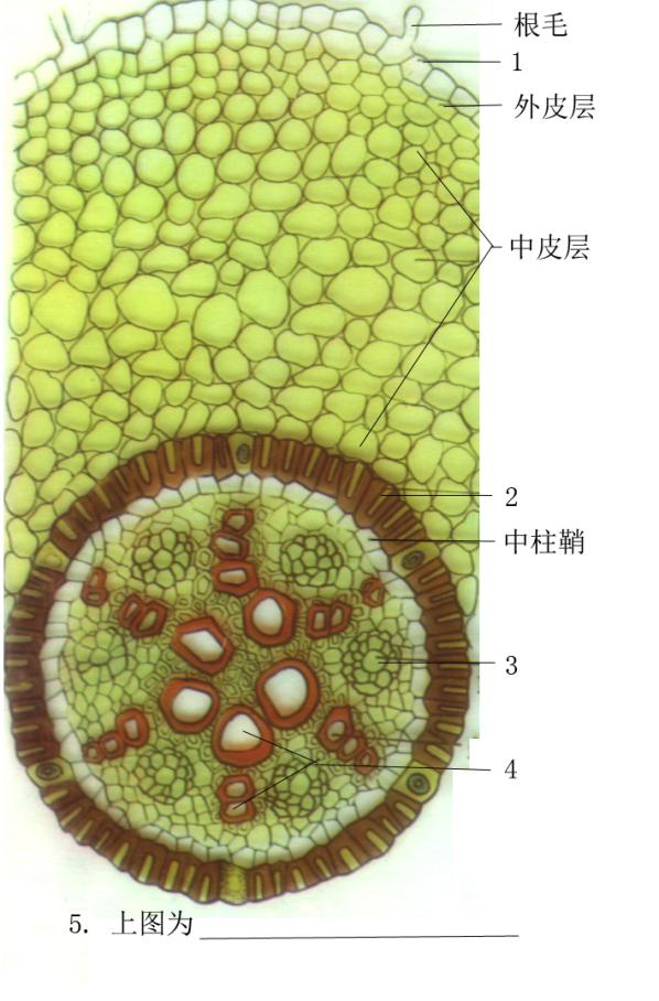 1. ________ 2. ________ 3. ________ 4. ________ 5. ________A.表皮 B.初生韧皮部 C.初生木质部 D.外皮层E.中皮层 F.内皮层 G.次生木质部 H.次生韧皮部 I.中柱鞘 J.髓