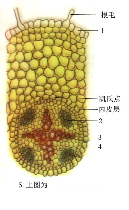 1. ________ 2. ________ 3. ________ 4. ________ 5. ________ A.表皮 B.初生韧皮部 C.初生木质部 D.中柱鞘 E.次生韧皮部 F.次生木质部 G.双子叶植物根的初生结构 H.禾本科植物根的结构 I.周皮 J.维管形成层