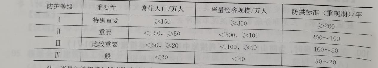 解析:参见GB50201-2014《防洪标准》。4.2.1城市防护区应根据政治、经济地位的重要性、常住人口或当量经济规模指标分为四个防护等级,其防护等级和防洪标准应按表4.2.1(表2-12)确定。