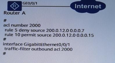 acl number 2000]rule 5 deny source 200.0.12.00.0.0.7 rule 10permit source200.0.12.00.0.0.15 # interface GigabitEthernetO/0/1 traffic-filteroutbound acl2000