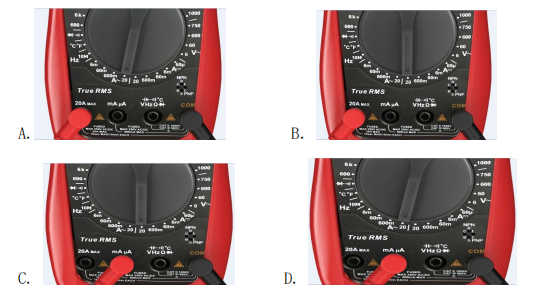 2、 现需使用万用表电流测试功能通过串联进电路方式测量一台直流电机工作电流,该直流 电机工作电流约为 5A,则万用表表笔位置插入正确的是( )【 ☆ 】